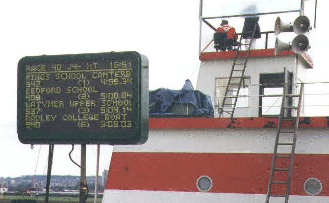 Mikrotime Electronic Scoreboards and LED DisplaysMIKROTIME Systems are "Real Time", networked systems. It is therefore possible to display results as they happen. Mikrotime provide two types of large display at their events. Large, Electro-Magnetic 'Flip Dot' Electronic Scoreboards which show up brightly in sunshine or under ultra-violet lighting and LED Tri-Colour LED Displays where large colourful text can also be provided for spectators so that the instant a competitor crosses the finish line, the result (time and position in class) can be immediately shown.Our displays are very effective to promote sponsor messages as well as displaying event results. Here are some photographs of Scoreboards and LED COLOUR Displays in use at our events |